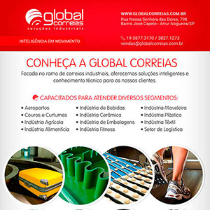 A Global Correias é uma empresa que há anos atua no mercado nacional como fabricante de correias e esteiras transportadoras. Trabalhando com profissionais altamente qualificados, a Global Correias oferece também serviços de manutenção e acompanhamento técnico de seus equipamentos, proporcionando ao cliente atendimento personalizado.